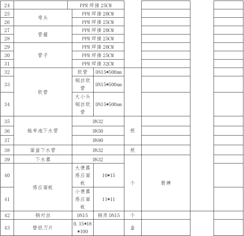 水暖配件、五金件、电料配件及灯具等各类配件进行采购,现诚邀资质合格的单位参加报价,请按项目列表所列明细给出相应报价。