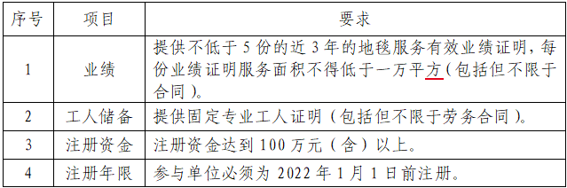 (四)参与本次项目的企业单位营业执照经营范围需具备相关服务,包含地毯销售、地毯铺装服务等符合项目要求的业务范围,且有效营业执照上所载明的营业期限余额不得少于本次采购的相关合同基本义务履行所需期限,公司注册资本金不少于100万元,具备一般纳税人资格、可开具增值税专用发票。