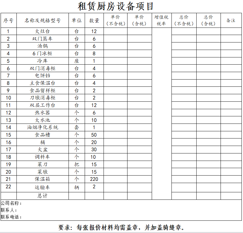 项目概况:为满足展会供餐需求,现需租赁厨房设备项目进行招募(详情见附件:询价清单)
